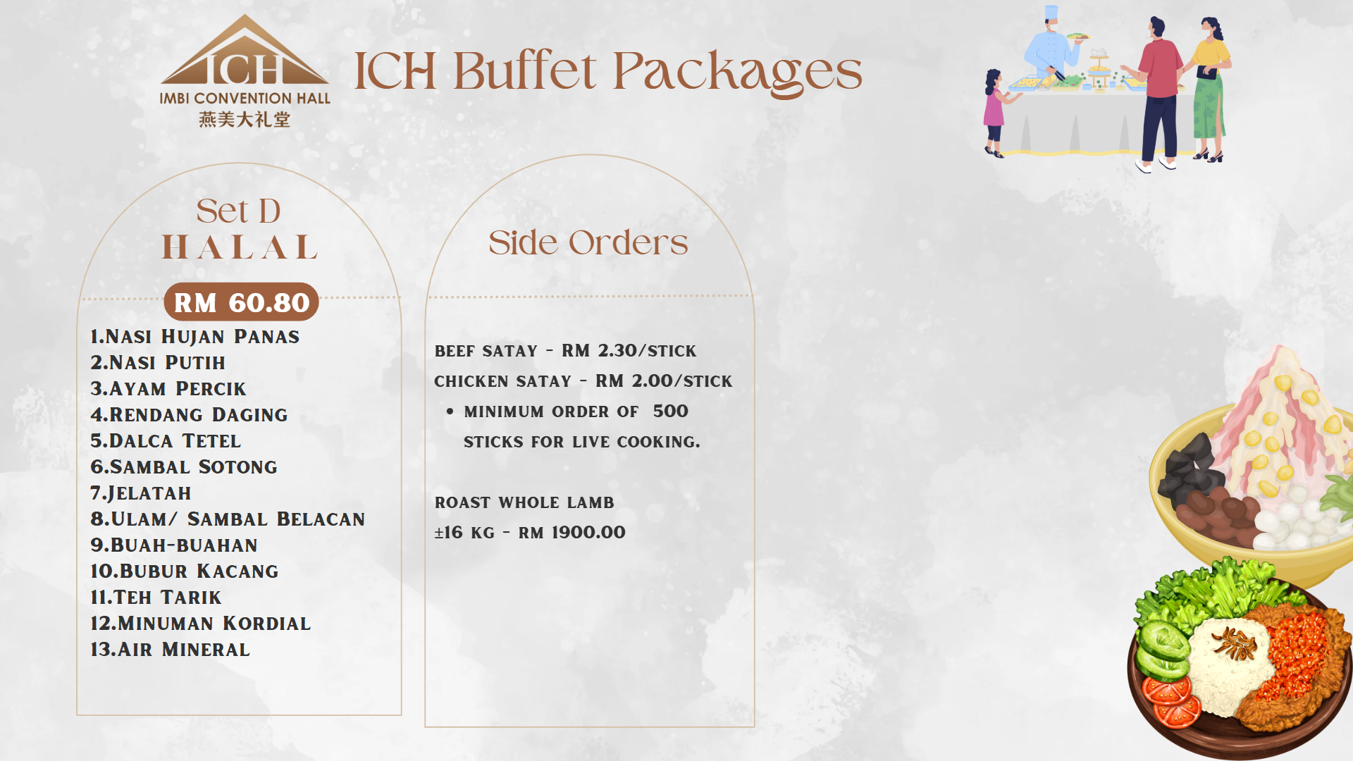 于ICH 进行自助餐宴需支付 Rm 5500.00 场地附加费。 - PRICE SHOWN IS ONLY AVAILABLE FOR THE YEAR OF 2025.